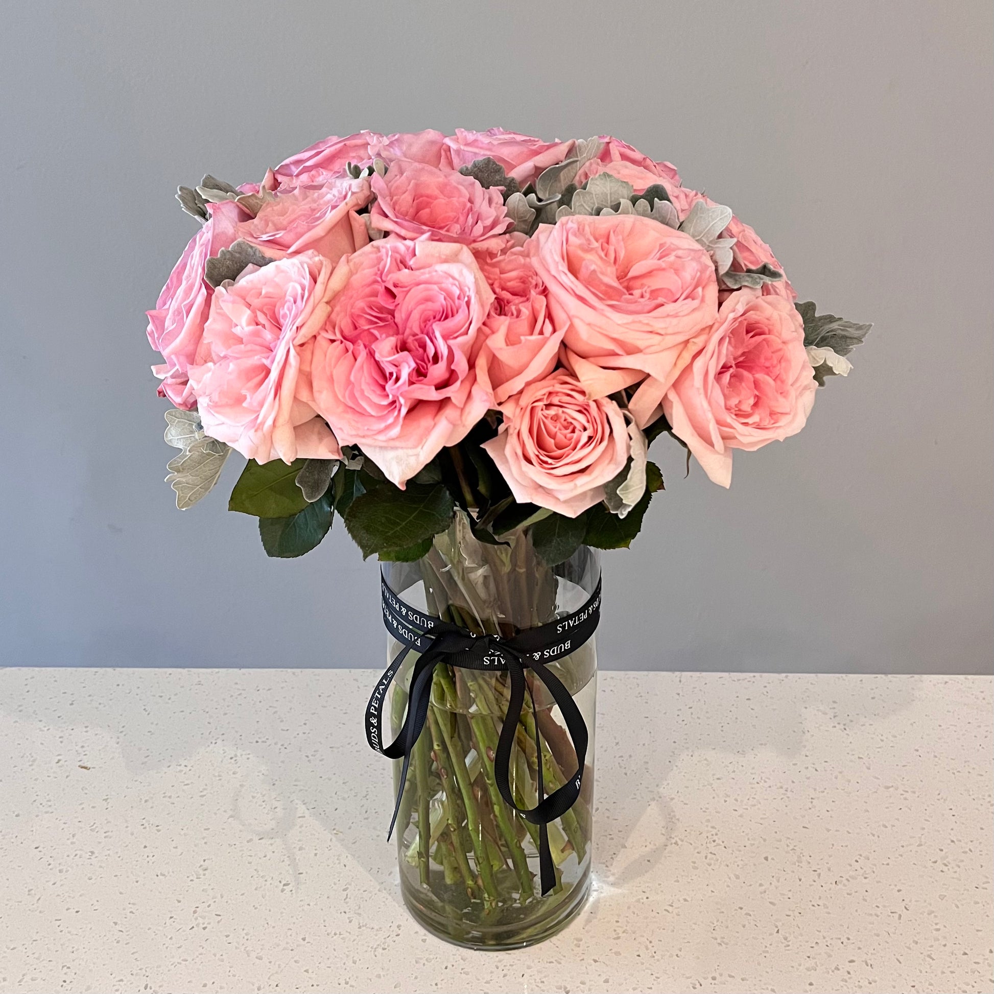 Two Dozen of gorgeous pink garden roses in a clear vase.