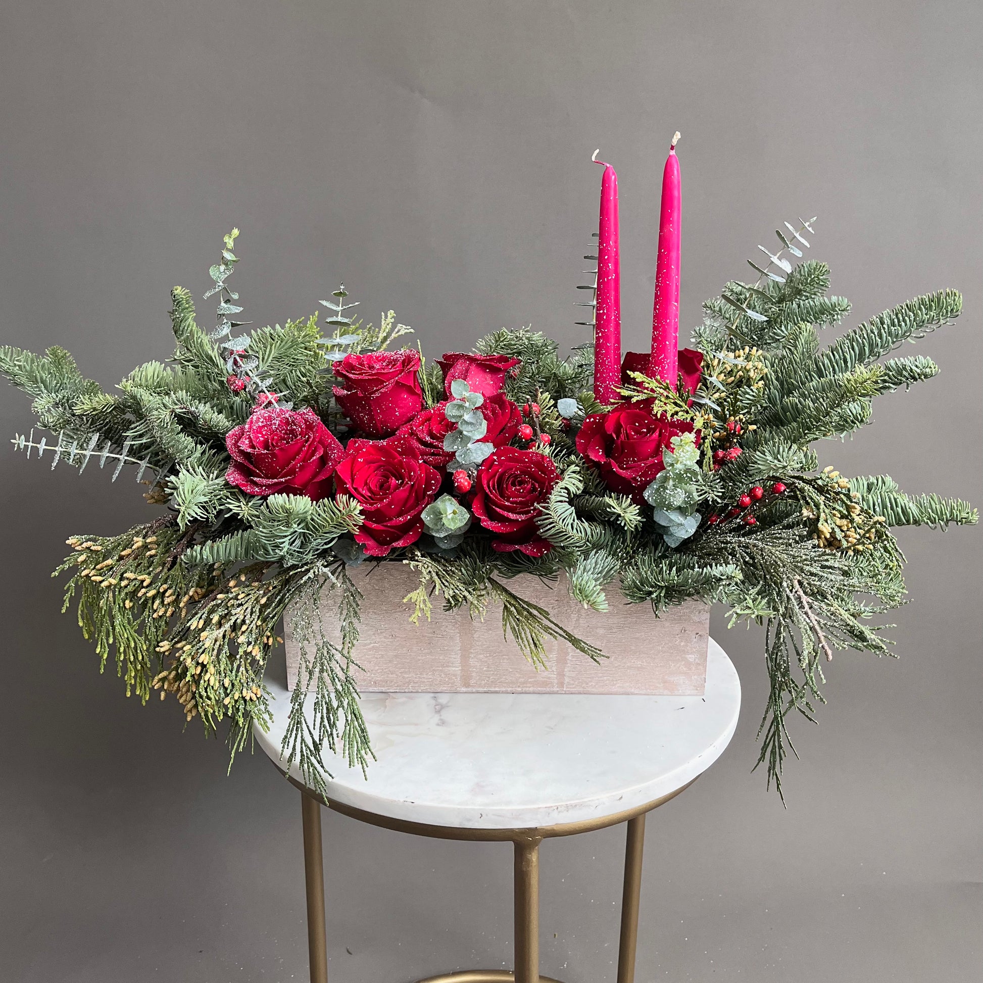 Introducing our 'Snowy Glow Box'—a captivating blend of winter enchantment. Delight in the snowy elegance of red roses, Nobel fir, eucalyptus, and fir, beautifully arranged with two red candles and adorned with festive red berries. This charming ensemble, housed in a rustic wooden box, is your key to a season filled with warmth and joy. Embrace the magic of the holidays with our Snowy Glow Box, available now at our online store.