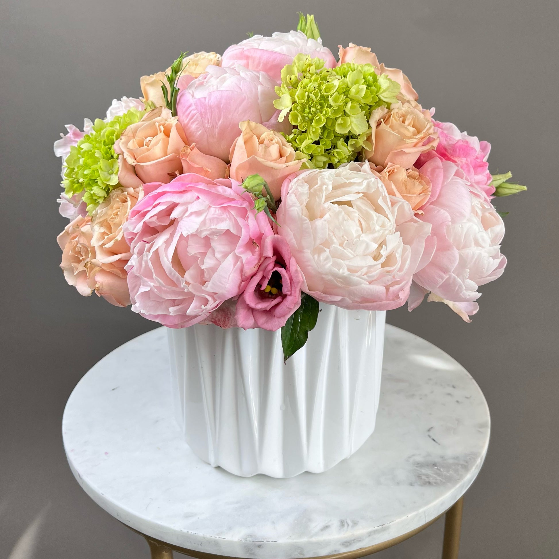 An opulent arrangement in a white ceramic vase. Mix of peonies, garden spray roses, mini hydrangea, and lisianthus.