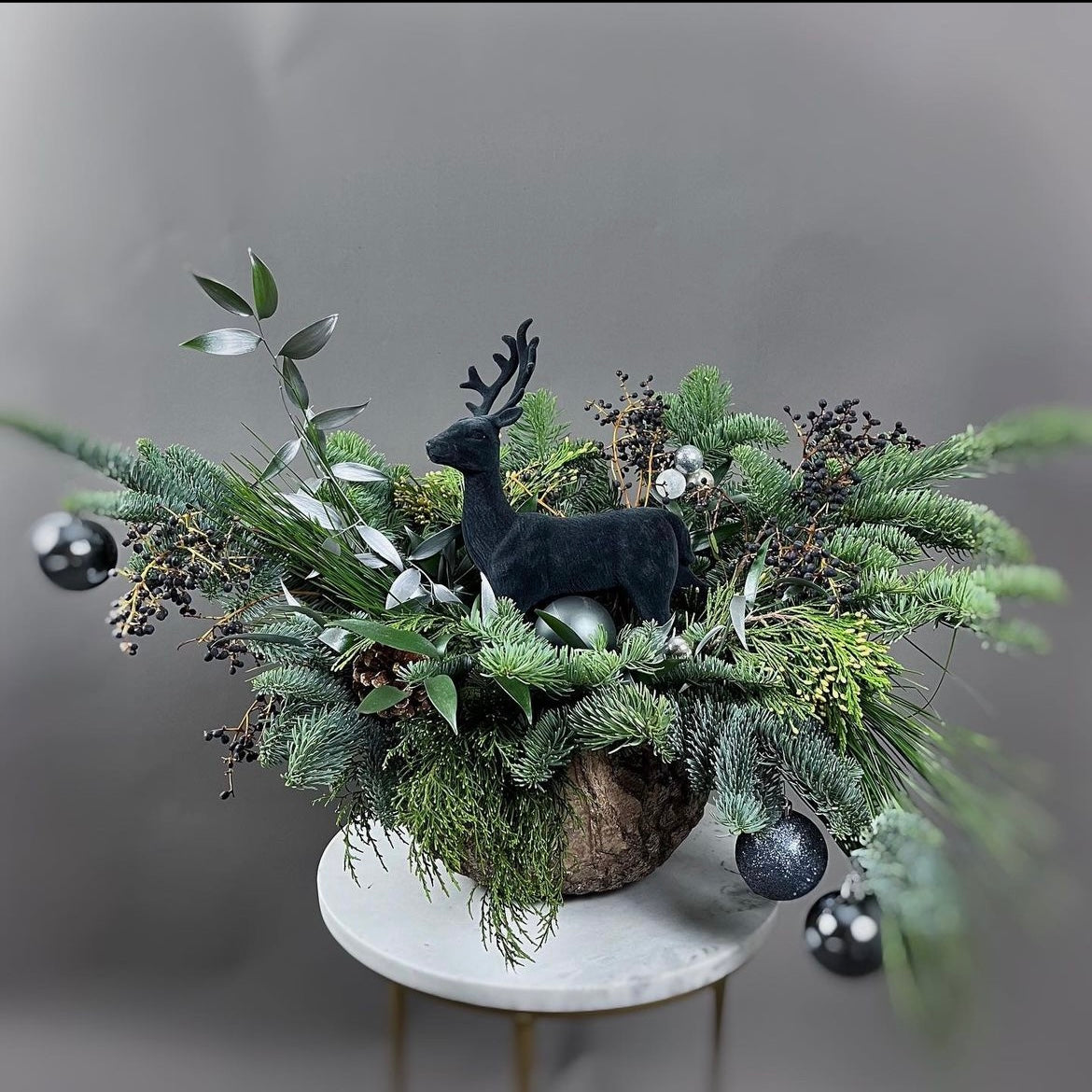 Introducing our enchanting "Winter Forest" vase arrangement, a harmonious blend of noble fir, fir, Italian ruscus, and black berries. Adorned with elegant grey and dark blue ornaments, this piece captures the serene beauty of the season. Complete with a charming grey deer decor, it's a sophisticated addition to your winter decor collection. Embrace the magic of the holidays with this stunning arrangement.